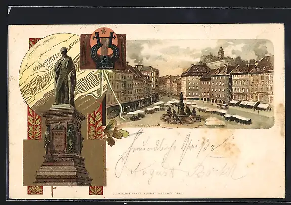 Lithographie Graz, Haupt-Platz, Erzherzog Johann, Harfe