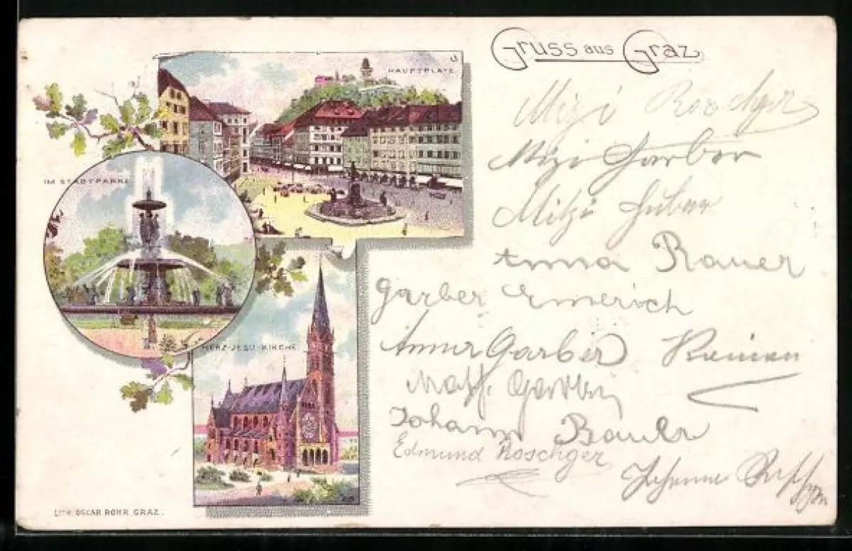 Lithographie Graz, Herz-Jesu-Kirche, Hauptplatz, Im Stadtpark