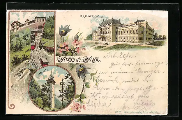 Lithographie Graz, Hilmwarte, K. K. Universität und Bergbahn