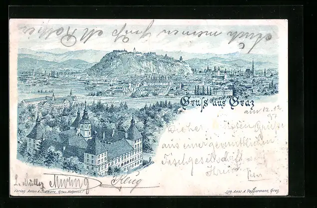 Lithographie Graz, Ortsansicht aus der Vogelschau