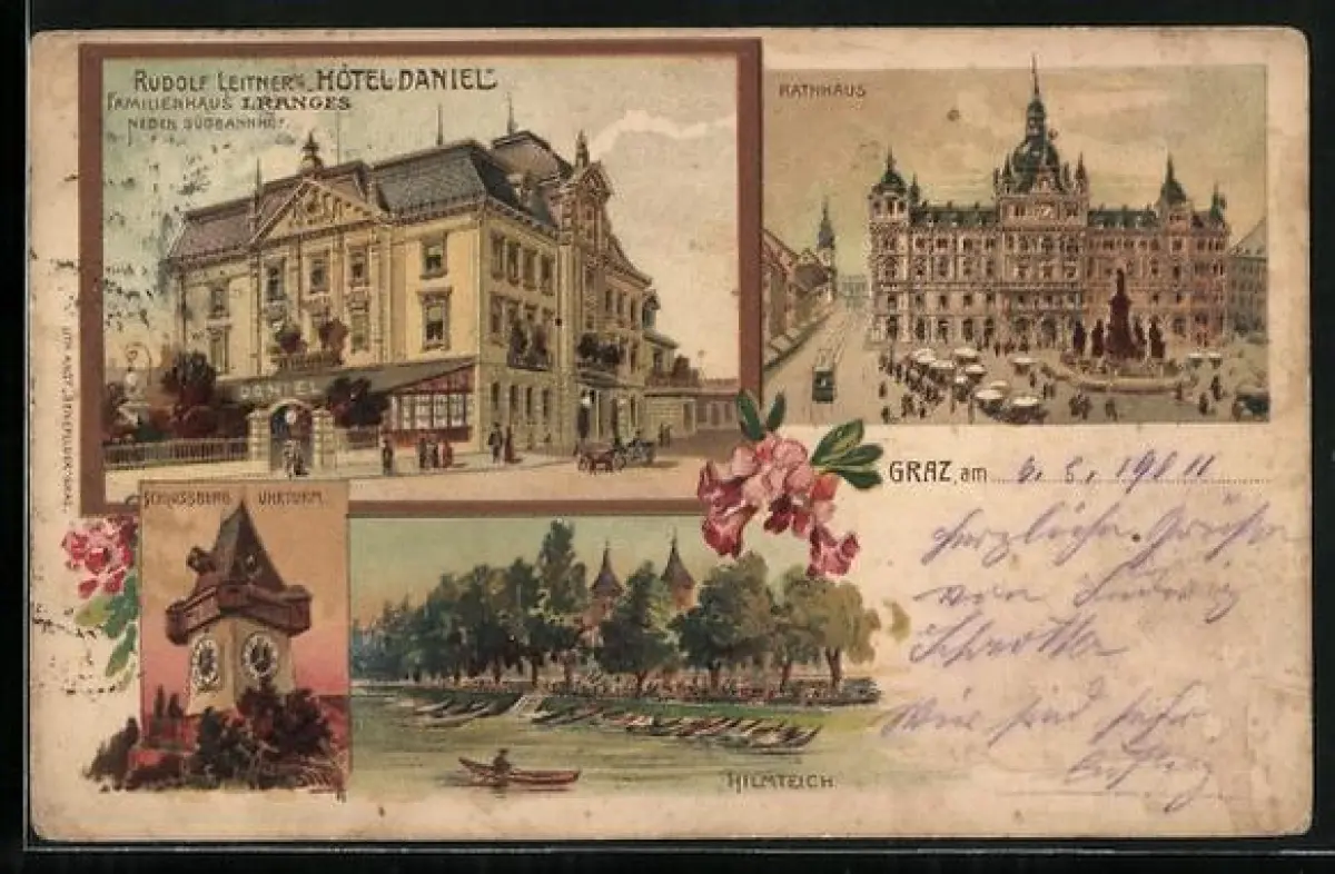 Lithographie Graz, Rudolf Leitner`s Hotel Daniel, Rathaus, Hilmteich und Schlossberg Uhrturm