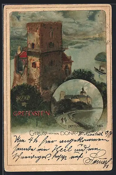 Lithographie Greifenstein /Donau, Burgruine über der Donau, Persenbeug