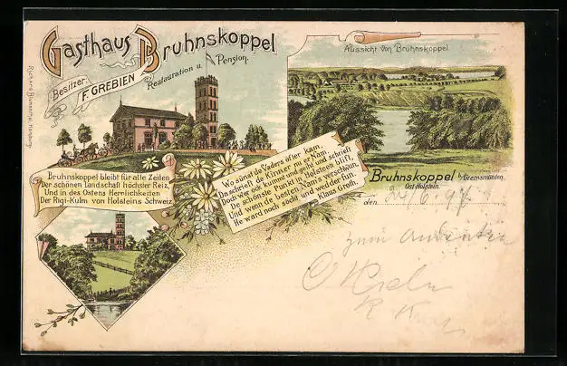 Lithographie Gremsmühlen, Gasthaus Bruhnskoppel v. F. Grieben, Aussicht von Bruhnskoppel