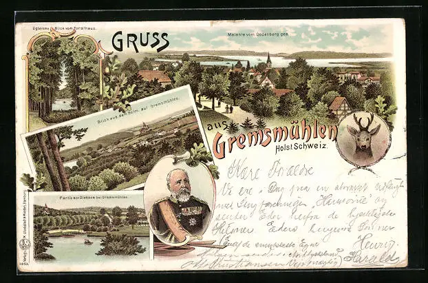 Lithographie Gremsmühlen /Holst. Schweiz, Blick vom Forsthaus auf den Ugleisee, Blick aus dem Holm auf den Ort