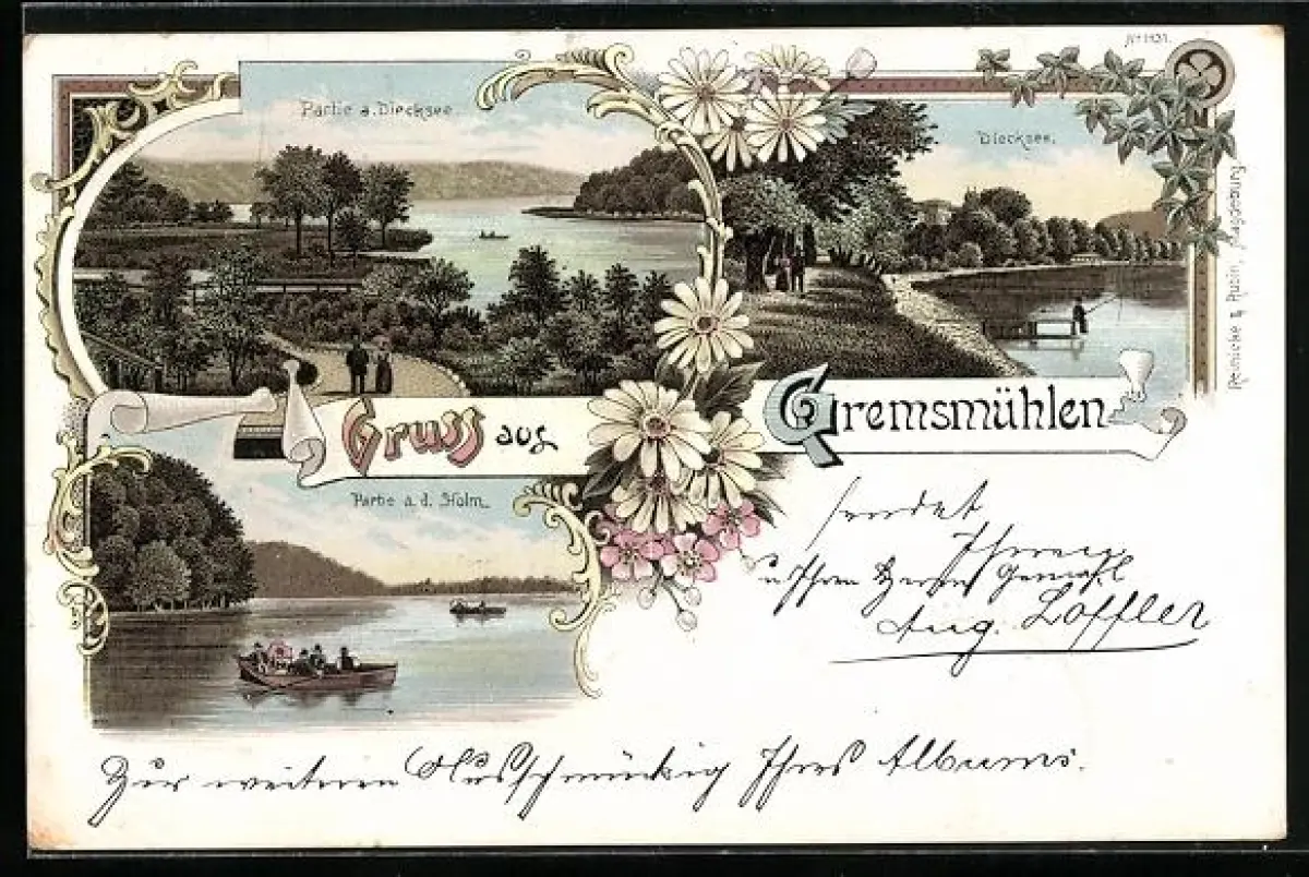 Lithographie Gremsmühlen, Partie a. Diecksee, Angler, Partie a. d. Holm mit Booten