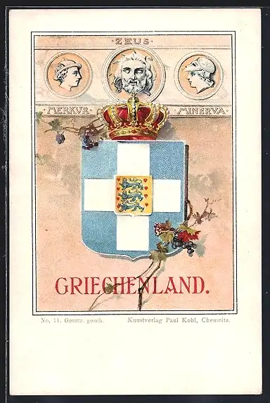 Lithographie Griechenland, Zeus, Merkur im Porträt, Minerva, Wappen