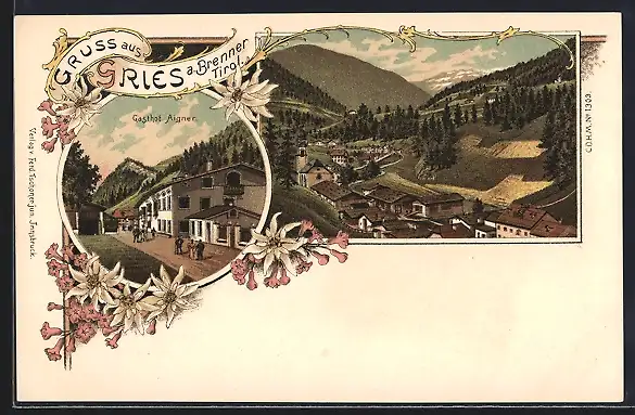 Lithographie Gries a. Brenner, Gasthof Aigner, Ortsansicht im Tallauf