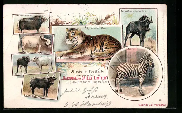Lithographie Grösste Schaustellung der Erde, Der ruhende Tiger, Zebra, Der weisse Büffel, Zirkus