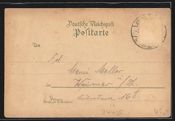 Personenbezogene Daten auf der Rückseite der Karte wurden durch blauen Textmarker unkenntlich gemacht. Die blauen Stellen sind auf die Vorderseite durchgeweicht und wirken sich negativ auf das Postkartenfoto aus