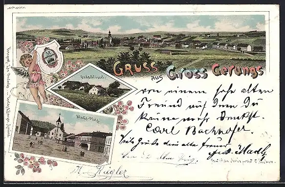 Lithographie Gross Gerungs, Oedschlössel, Marktplatz und Totalansicht