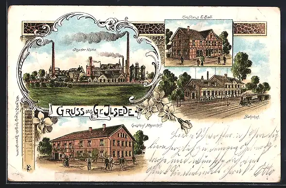 Lithographie Gross Ilsede, Gasthof Meyerhoff, Bahnhof, Ilseder Hütte, Kaufhaus E. Ball