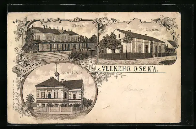 Lithographie Gross Wosek, Skola Obekna, Bahnhof von der Gleisseite
