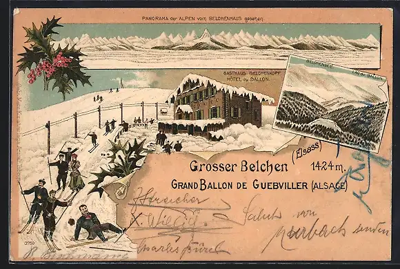 Lithographie Grosser Belchen, Gasthaus Belchenkopf, Hotel du Ballon, Belchensee, Panorama
