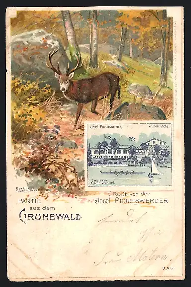 Lithographie Grunewald, Insel Pichelswerder und Hirsch im Wald