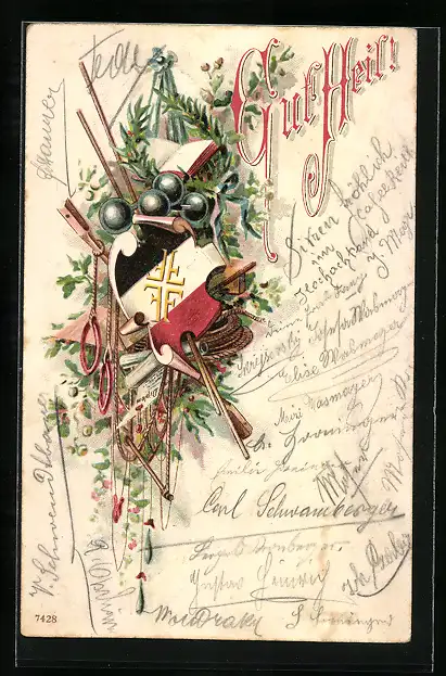 Lithographie Gut Heil, Deutscher Turnerbund, Turnerkreuz mit Turngeräten, Ringe, Gewichte und Springseile