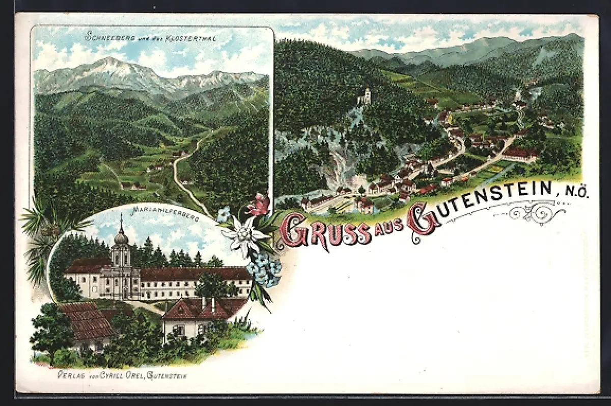 Lithographie Gutenstein, Schneeberg & das Klosterthal, Mariahilferberg, Ortsansicht aus der Vogelschau
