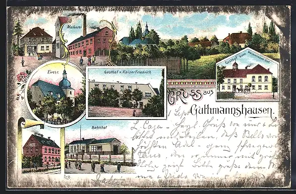 Lithographie Guthmannshausen, Gasthof zum Weimarischen Hof, Gasthof zum Kaiser Friedrich, Molkerei, Bahnhof