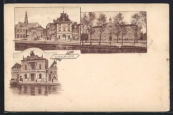 Lithographie Haarlem, Rathaus, Strassenpartie, Uferpartie