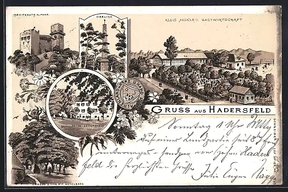 Lithographie Hadersfeld, Alois Aigner`s Gasthaus, Ruine Greifenstein, Obelisk, Schloss in Hadersfeld