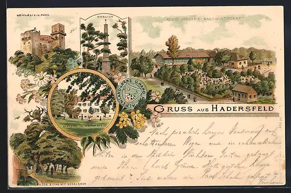 Lithographie Hadersfeld, Alois Aigner`s Gasthaus, Ruine Greifenstein, Obelisk, Schloss in Hadersfeld