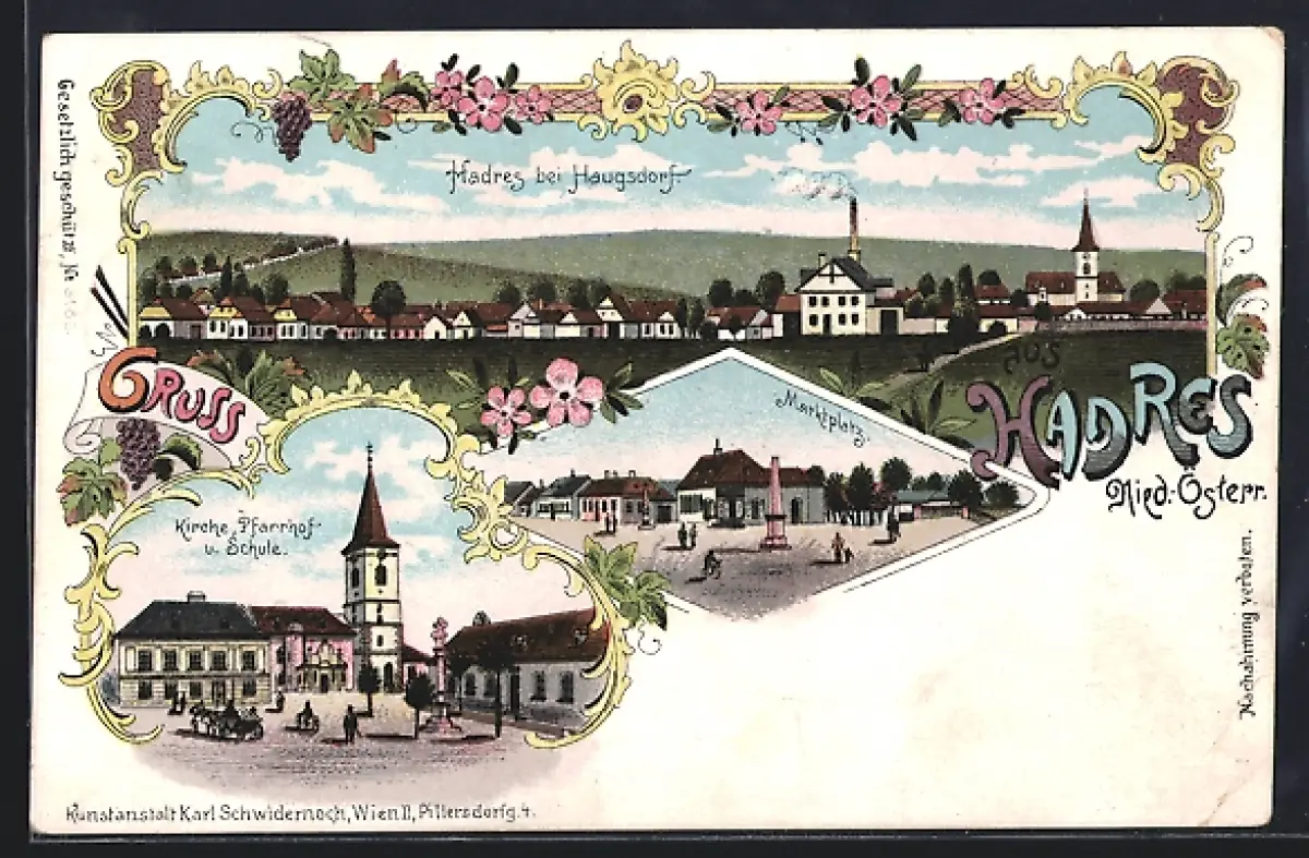 Lithographie Hadres bei Haugsdorf, Teilansicht, Kirche, Pfarrhof und Schule, Marktplatz
