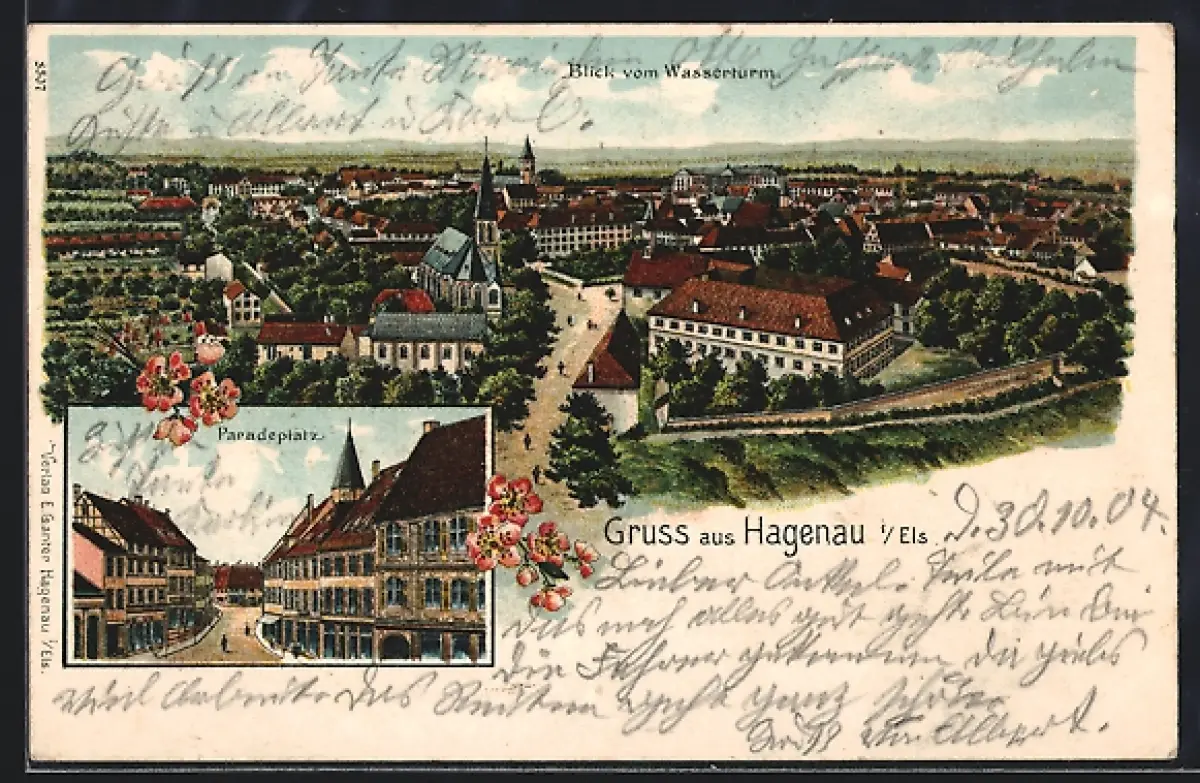 Lithographie Hagenau i. Els., Paradeplatz, Blick vom Wasserturm