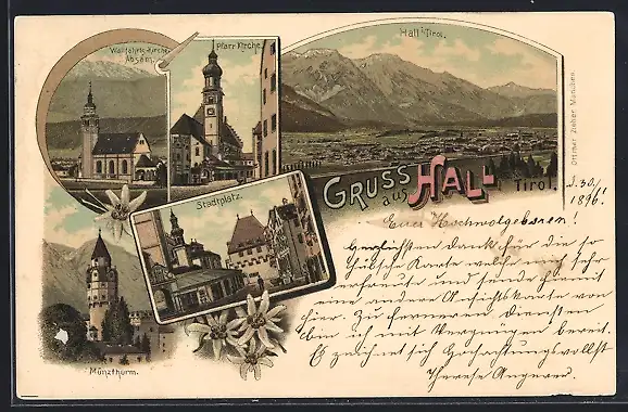 Lithographie Hall /Tirol, Stadtplatz, Münzturm, Pfarr-Kirche, Wallfahrtskirche Absam