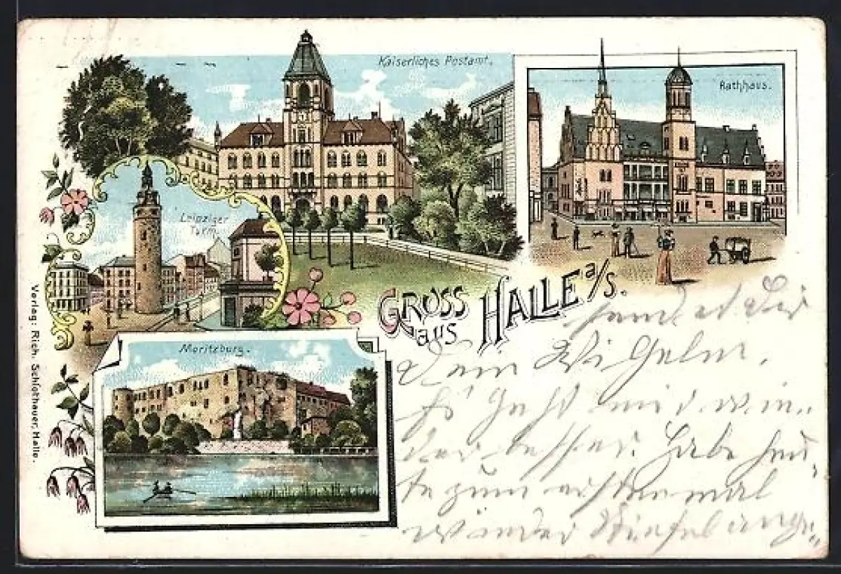 Lithographie Halle / Saale, Marktplatz mit Rathaus, kaiserliches Postamt, Moritzburg