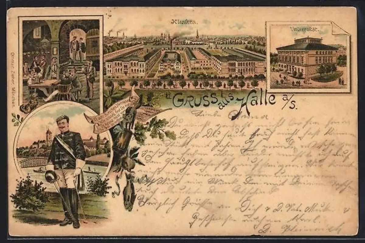 Lithographie Halle a. S., Kliniken, Universität, Student im vollen Wichs