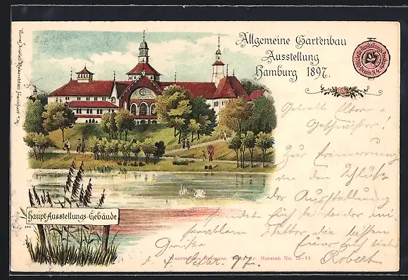 Lithographie Hamburg, Allegemeine Gartenbau-Ausstellung 1897, Blick auf das Haupt-Ausstellungsgebäude