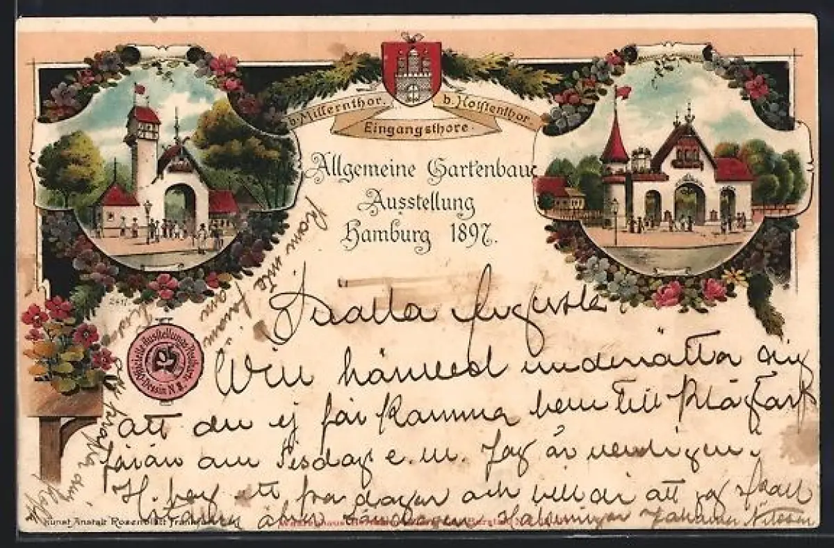 Lithographie Hamburg, Allgemeine Gartenbau-Ausstellung 1897, Eingangsthore