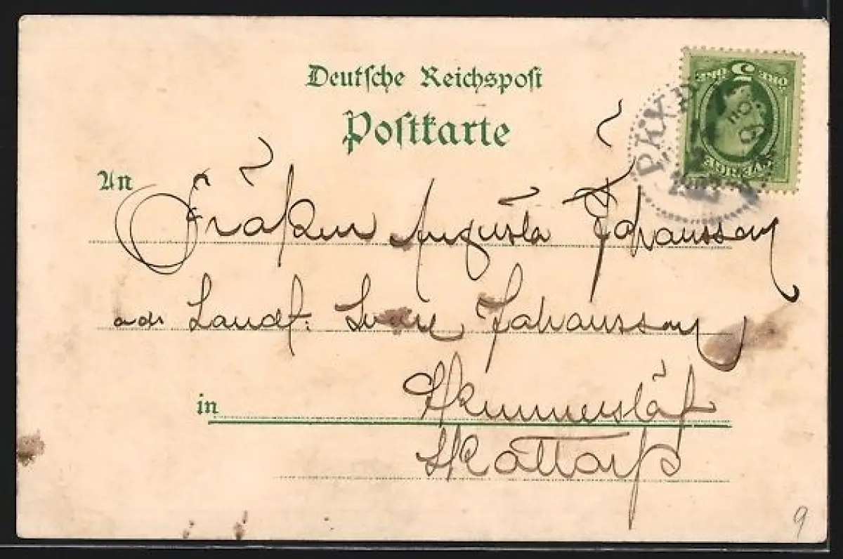 Personenbezogene Daten auf der Rückseite der Karte wurden durch blauen Textmarker unkenntlich gemacht. Die blauen Stellen sind auf die Vorderseite durchgeweicht und wirken sich negativ auf das Postkartenfoto aus