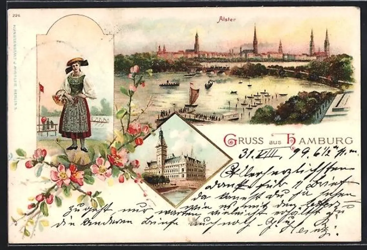 Lithographie Hamburg, Alsterpartie, Frau in Tracht