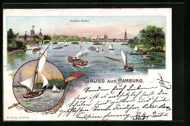 Lithographie Hamburg, Aussen-Alster, Segelboot