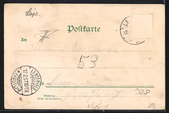 Personenbezogene Daten auf der Rückseite der Karte wurden durch blauen Textmarker unkenntlich gemacht. Die blauen Stellen sind auf die Vorderseite durchgeweicht und wirken sich negativ auf das Postkartenfoto aus