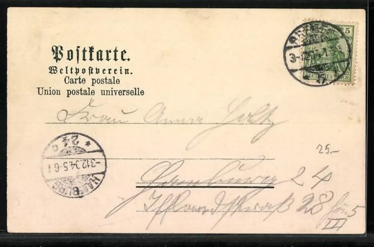 Personenbezogene Daten auf der Rückseite der Karte wurden durch blauen Textmarker unkenntlich gemacht. Die blauen Stellen sind auf die Vorderseite durchgeweicht und wirken sich negativ auf das Postkartenfoto aus