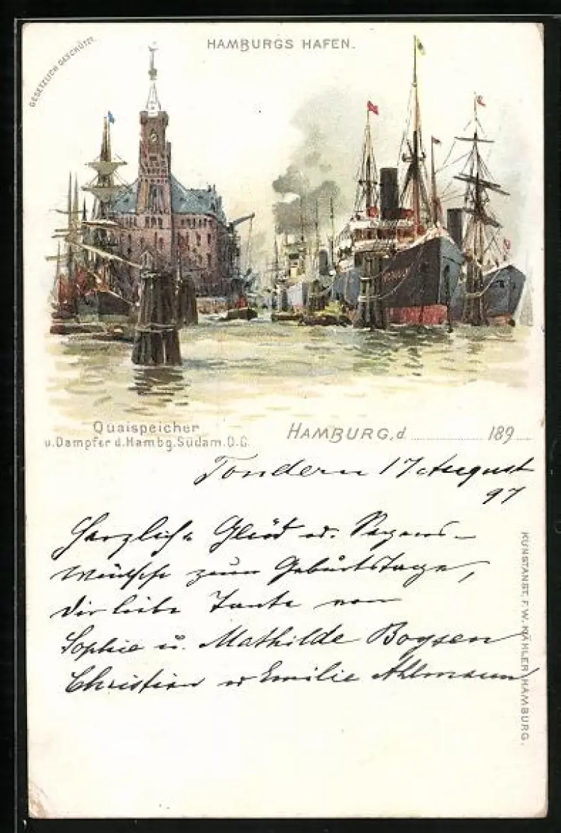 Lithographie Hamburg, Hafen, Quaispeicher u. Dampfer d. Hamburg-Südamerika DG, Segelschiffe