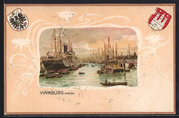 Lithographie Hamburg, Hafen im Abendlicht