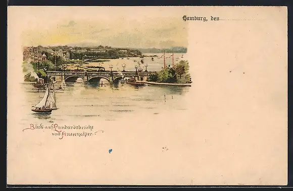 Lithographie Hamburg-Neustadt, Blick auf Lombardsbrücke und Aussenalster