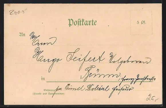 Personenbezogene Daten auf der Rückseite der Karte wurden durch blauen Textmarker unkenntlich gemacht. Die blauen Stellen sind auf die Vorderseite durchgeweicht und wirken sich negativ auf das Postkartenfoto aus