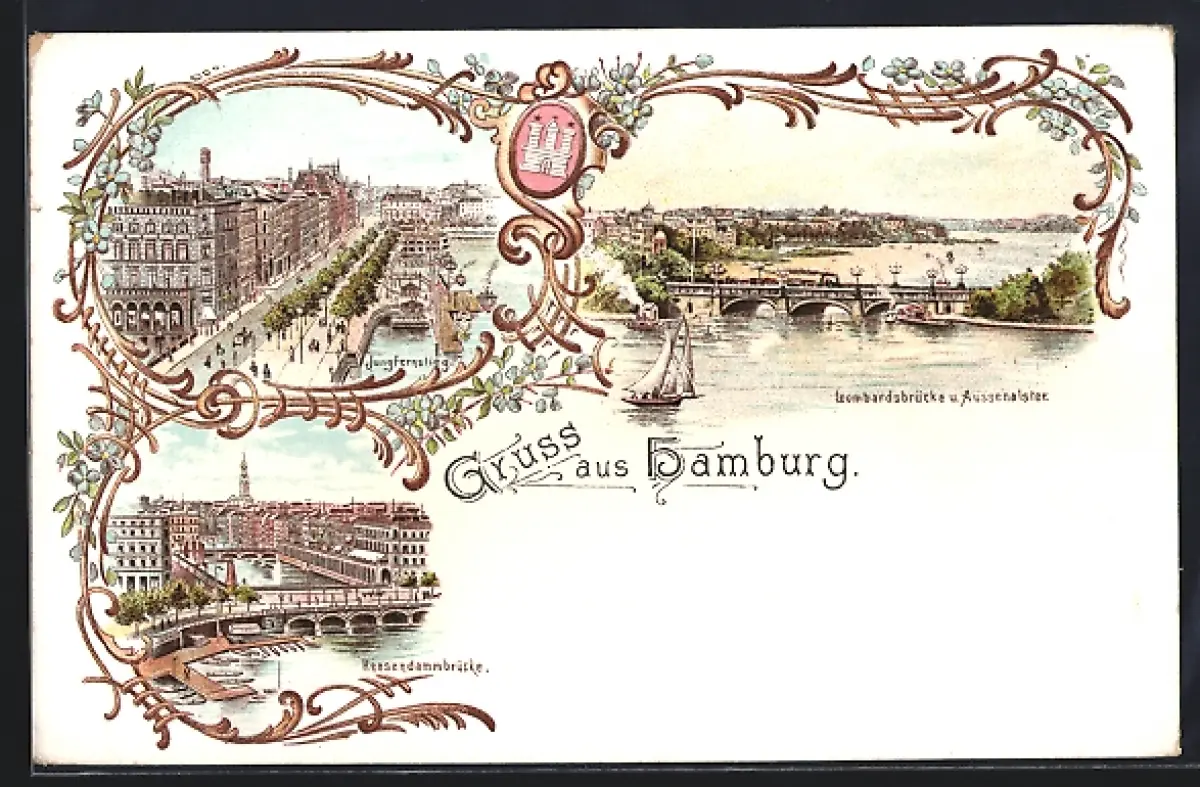 Lithographie Hamburg-Neustadt, Jungfernstieg, Lombardsbrücke, Reeserdammbrücke