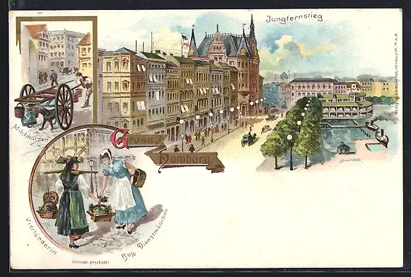 Lithographie Hamburg-Neustadt, Jungfernstieg, Milchkarren, Hamburger Dienstmädchen und Vierländerin