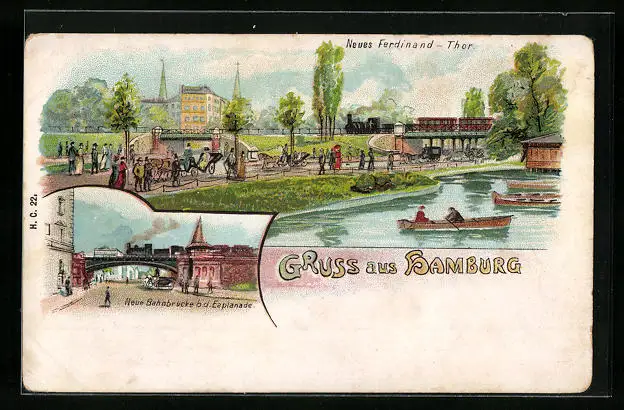 Lithographie Hamburg-Neustadt, Neues Ferdinand-Thor, Neue Bahnbrücke bei d. Esplanade