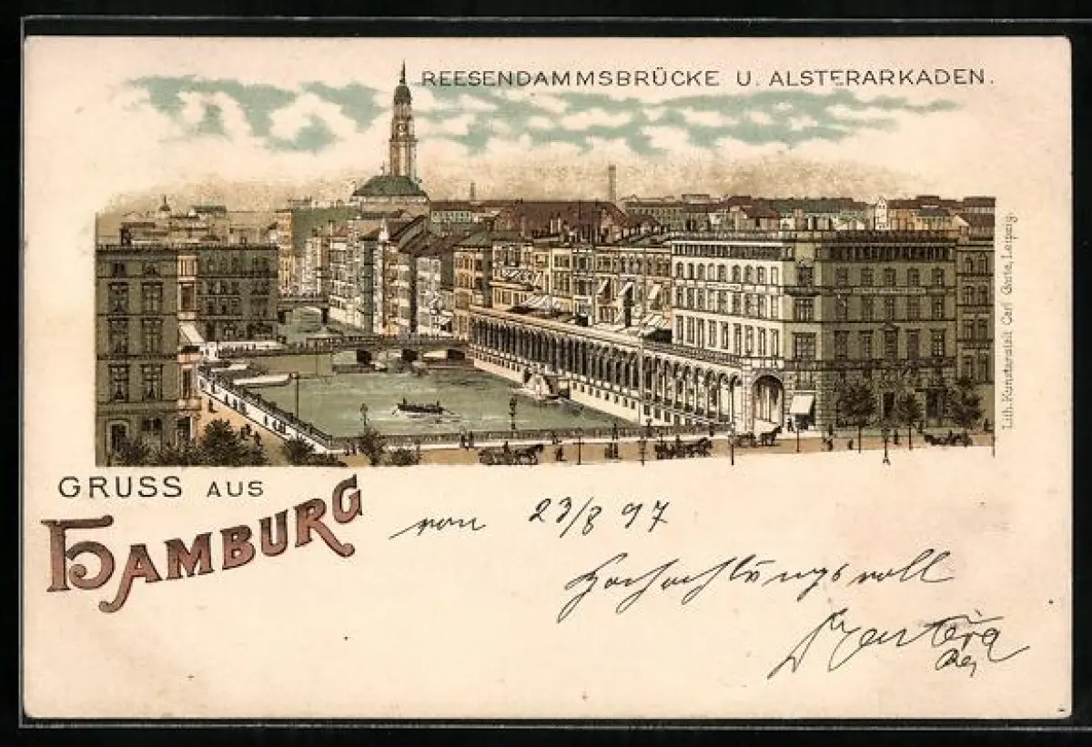 Lithographie Hamburg, Reesendammbrücke, Alsterarkaden