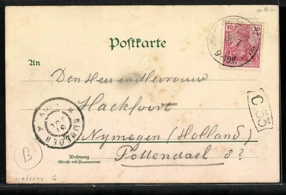 Personenbezogene Daten auf der Rückseite der Karte wurden durch blauen Textmarker unkenntlich gemacht. Die blauen Stellen sind auf die Vorderseite durchgeweicht und wirken sich negativ auf das Postkartenfoto aus