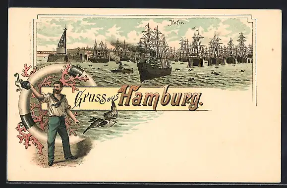 Lithographie Hamburg, Segler im Hafen und Matrose mit Möwe