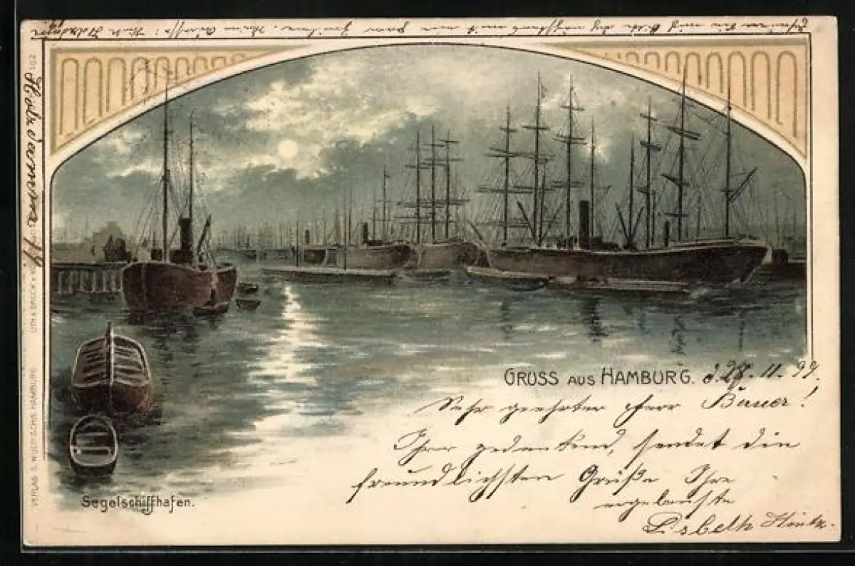 Lithographie Hamburg, Sicht auf den Segelschiffhafen