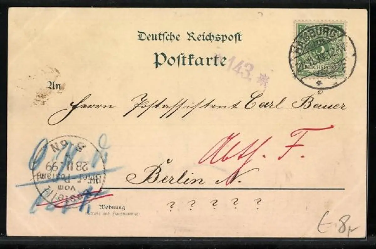 Personenbezogene Daten auf der Rückseite der Karte wurden durch blauen Textmarker unkenntlich gemacht. Die blauen Stellen sind auf die Vorderseite durchgeweicht und wirken sich negativ auf das Postkartenfoto aus