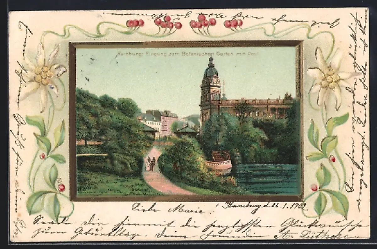 Lithographie Hamburg-St.Pauli, Eingang zum Botanischen Garten mit Post, Edelweiss, Passepartout