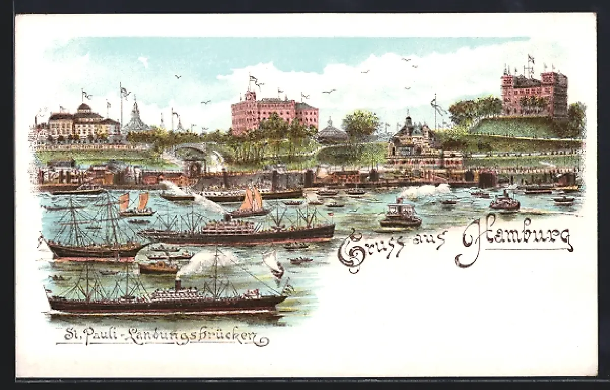 Lithographie Hamburg-St.Pauli, Landungsbrücken, Hafenansicht, Schiffe